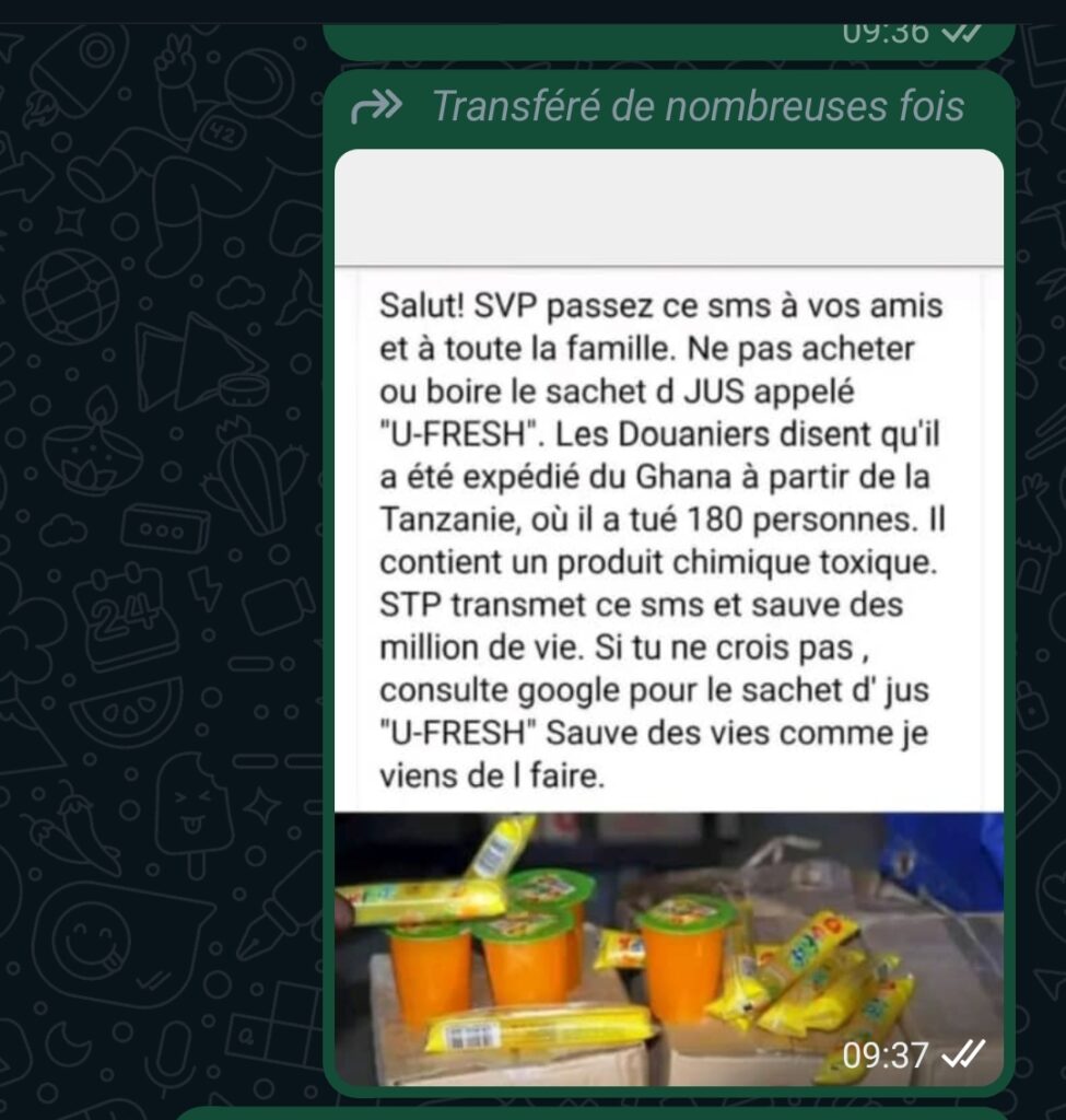 Voici ce qui est inscrit comme la lĂ©gende du post : « Salut! SVP passez ce sms Ă vos amis et Ă toute la famille. Ne pas acheter ou boire le sachet du jus appelĂ© *U-FRESH*. Les douaniers disent quâil a Ă©tĂ© expĂ©diĂ© du Ghana Ă partir de la Tanzanie, oĂč il a tuĂ© 180 personnes. Il contient un produit toxique. STP transmet ce sms et sauvĂ© des millions de vies. Si tu ne crois pas, consulte Google.».