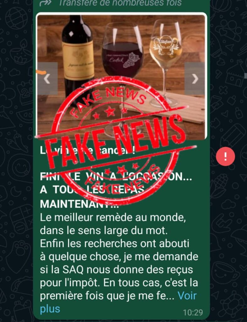Circulée dans plusieurs groupes WhatsApp avec la mention « transféré de nombreuses fois », une information est devenue très virale. L’information  encourage les internautes  à  s’adonner au vin comme remède efficace qui guérit définitivement le cancer. Voici ce qu’indique la publication: « Fini le vin à l’occasion … A tous les repas maintenant !!! Le vin est un produit miraculeux pour tuer les cellules cancéreuses. Il est  10000 fois plus puissant que la chimiothérapie ….».