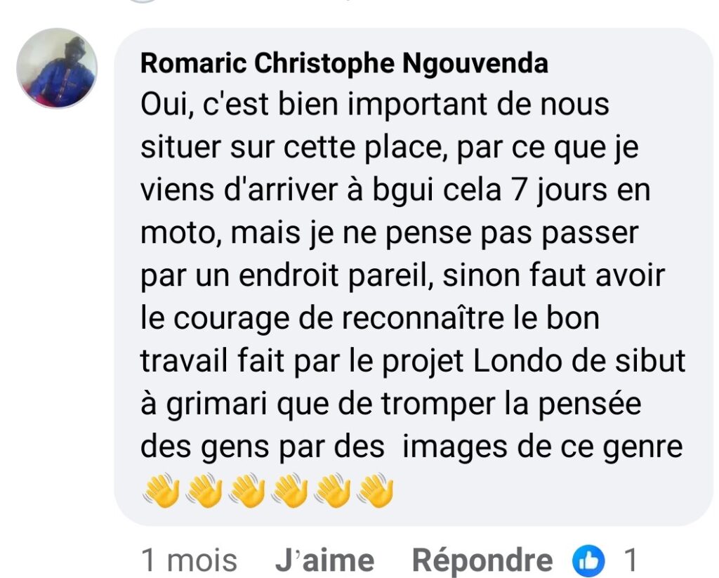 Le post a totalisé 65 mentions j’aime, 18 commentaires et 15 partages. Cette publication a suscité de vives réactions contradictoires parmi les internautes, comme « À quel niveau précisément ? » lâche un internaute, « vous êtes sérieux ? », ou encore « Oui c’est important de nous situer sur cette place, parce que je viens d’arriver à Bangui cela fait déjà sept jours à moto, mais je ne pense pas passer par cet endroit pareil, sinon il faut avoir le courage de reconnaître le bon travail fait par le projet Londo de Sibut à Grimari que de tromper la pensée des gens par des images de ce genre », a vivement réagi cet internaute qui récemment à emprunter cette voie.