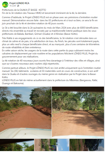 Plus loin encore, nous avons pu consulter la page  Facebook du Projet LÖNDO RCA, projet d’entretien routier qui a réhabilité le tronçon Sibut-Grimari le 28 mai 2024.  Dans une publication sur cette page datant du 16 avril 2024, il est clairement indiqué que les préfectures de la Ouaka et Basse-Kotto fin de la 3e rotation des Travaux HIMO et le lancement imminent de la 4e, la dernière. Comme d’habitude, le Projet LÖNDO PLUS est avec ses prévisions d’entretien routier manuel.
