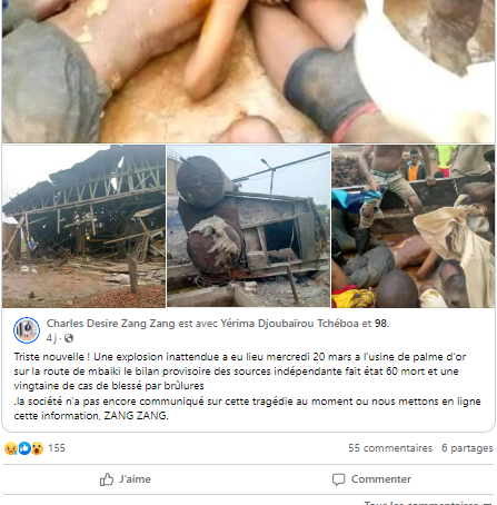 Une information montrant le bilan provisoire de 60 morts et une vingtaine cas de blessĂ©s par brĂ»lures des suites de lâincendie provoquant  une explosion de la chaudiĂšre Ă lâusine de raffinerie dâhuile de palme ââPalme Dâorââ, le mercredi 20 mars 2024 est fausse. Ces chiffres sont erronĂ©s selon le communiquĂ© officiel de la Direction GĂ©nĂ©rale de cette sociĂ©tĂ©.