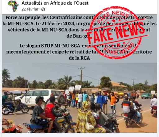 Un post Facebook affirme la manifestation dâun groupe des jeunes du 8á” arrondissement de Bangui qui auraient bloquĂ© les vĂ©hicules de la Minusca le 21 fĂ©vrier 2024, demandant leur dĂ©part du pays. Faux, ont confirmĂ© la mission des Nations Unies en Centrafrique, les...